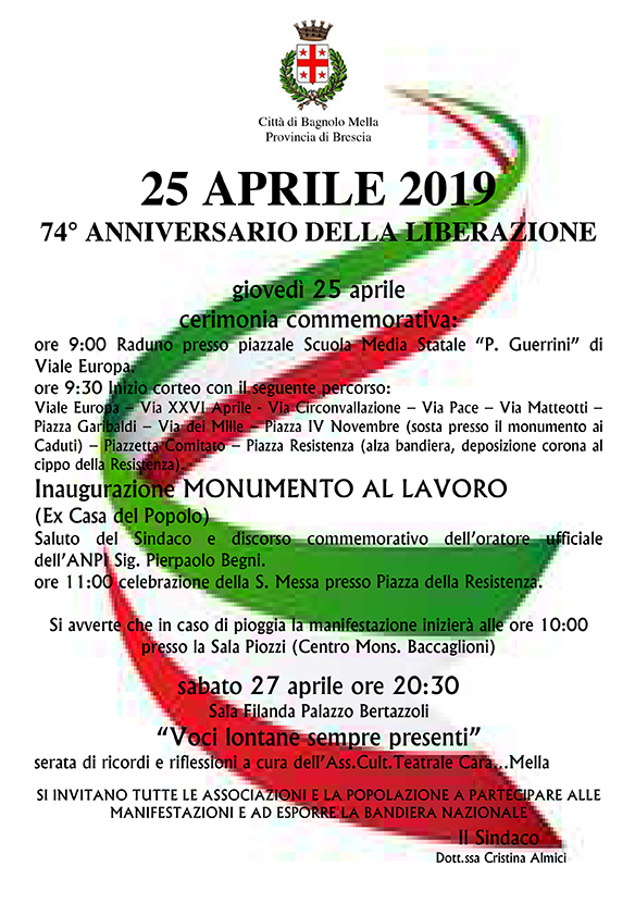 Vi aspettiamo Sabato 27 Aprile alle ore 20:30 presso Palazzo Bertazzoli, Bagnolo Nella (BS) per “Voci lontane sempre presenti”, una serata di ricordi e riflessioni in onore del 74° Anniversario della Liberazione.